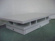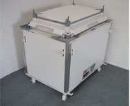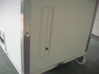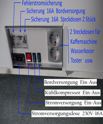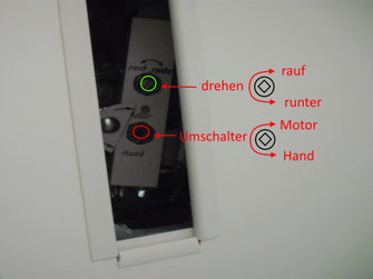Dazu muß die bezeichnete Abdeckung etwas nach oben geschoben und dann entnommen werden. Mit den nun freiliegenden 4 kant Rohrschlüssel wird dann an rot bezeichneter Stelle mit einer kurzen aber kräftigen Drehbewegung nach links auf Handbetrieb umgestellt. Dann wird der gleiche 4 kant Schlüssel in die grün gekennzeichnete 4 kant Steckbuchse geschoben und gedreht um die Kühleinheit zu heben oder zu senken.